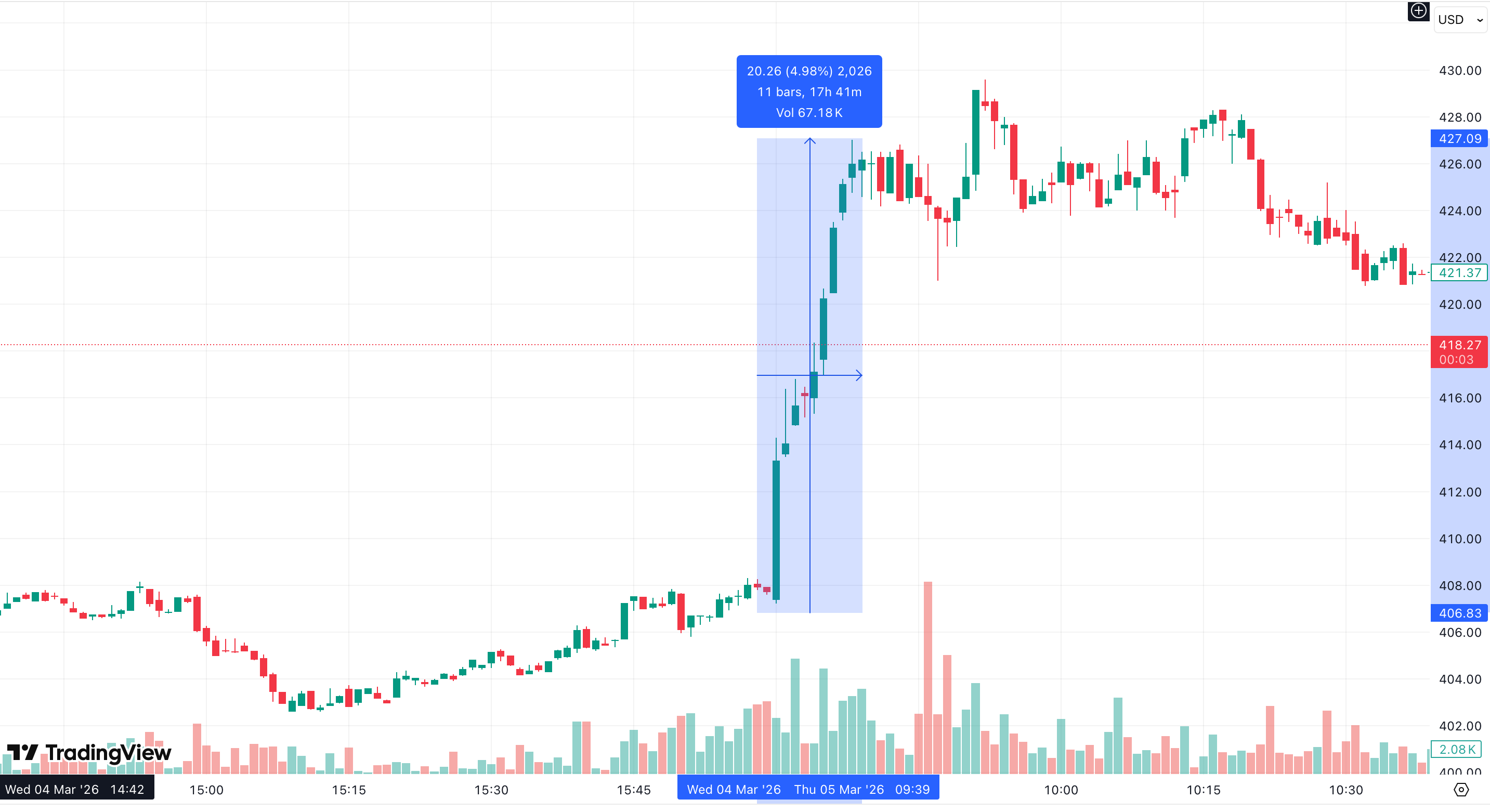 Intraday 1m plot, and I have annotated the length of the vertical move